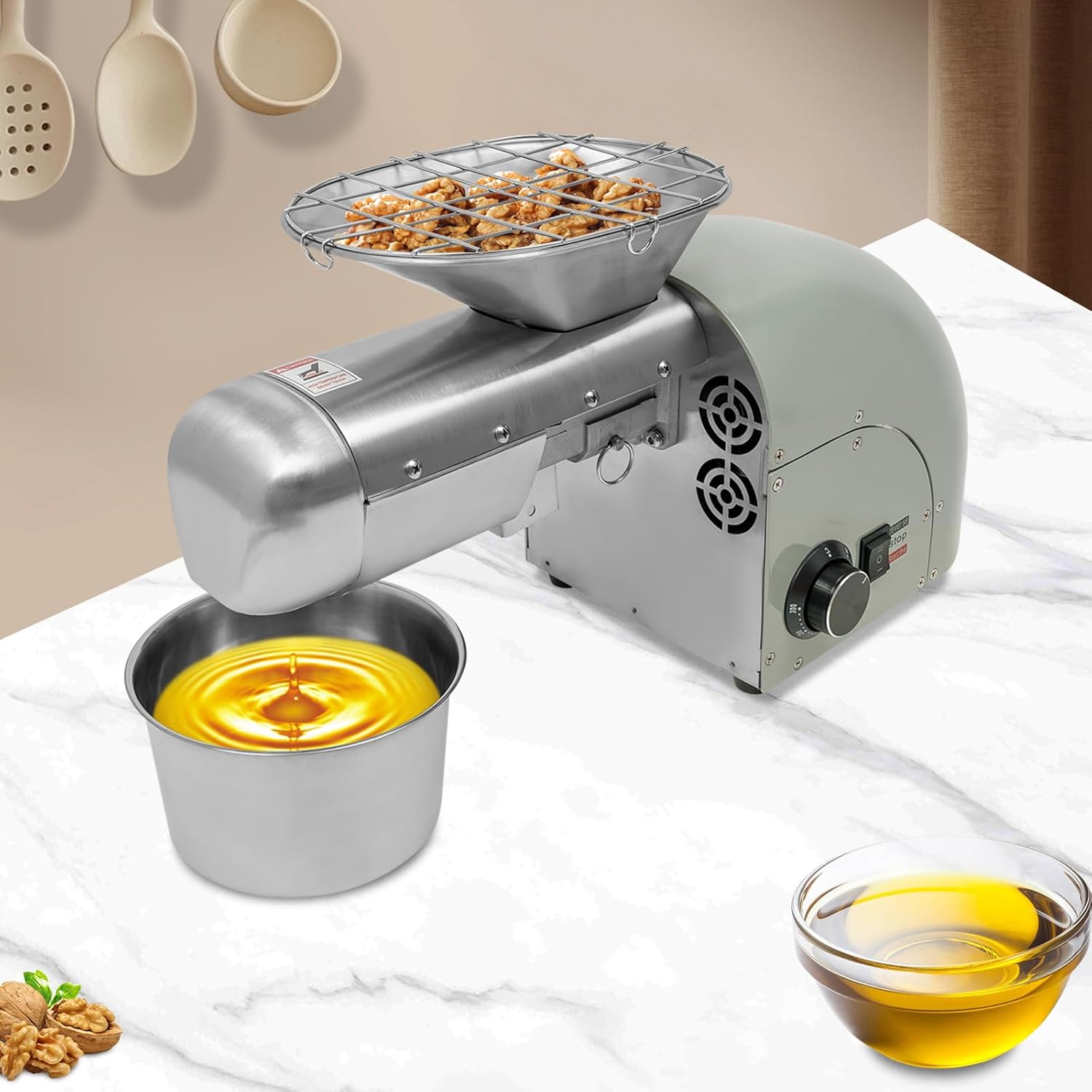 DescriptionThanks to the stainless steel body and all-copper motor, it guarantees superior durability and stability. Meanwhile, the superpower of 1800W supports it to finish the oil extraction work quickly, and it also ensures an oil yield of up to 95%. Using our oil press, you can enjoy the natural variety of oil at any time, which is a good investment for your health, and a good assistant for your healthy life.DetailsEnlarged Feed Opening: With a large capacity (27.1-33.8oz), it allows you to put a large amount of raw material at a time.Non-slip Feet: Four rubber feet can absorb the shock, prevent the machine from slipping, and avoid scratching the tabletop or floor.ApplicationThis product is suitable for home and small commercial use. You can use it to press peanuts, walnuts, soybeans, sesame seeds, rapeseed, sunflower kernels, linseed, flaxseed, flaxseed, yamakura seeds, tea seeds, perilla seeds, and more.SpecificationMaterial: 201 Stainless Steel, Copper, Rubber, Stainless SteelProcess: Painting, Wire DrawingMotor Type: All-copper Brushless MotorColor: SilveryStyle: ModernModel: WF-J168Voltage: AC110V 50/60HzAssembly Required: YesRated Power: 1250WMaximum Power: 1800WPlug Type: US StandardPower Source: Corded ElectricMount Type: Tabletop, Floor MountPressing Method: Cold, HotOil Yield: 95%Oil Pressing Speed: 5-8kg/11-17.6lbs/H (Peanut: 5kg/11lbs/H, Sesame: 6kg/13.2lbs/H)Feed Port Capacity: 801-1000ml/27.1-33.8ozOil Output: 1001-1500ml/33.84-50.72ozTemperature Range: 50-300℃/122-572°FPreheating Time: 5-8 MinutesEach Press Rod Size(D*H): 2.1*25.5cm/0.83*10.04inOil Cup Diameter: 19cm/7.48inFeed Port Bottom Size: 48*38mm/1.9*1.5inOverall Product Size(L*H): 50*29cm/19.67*11.42inPackage Size: 59.5*37.5*27.5cm/23.4*14.8*10.8inNet Weight: 12.2kg/26.9 lbGross Weight: 14.5kg/32 lbPackage Included1* Oil Press Machine1* Oil Cup1* Filter2* Press Rods(One in the Machine)1* Power Cord1* Glove1* Cleaning Brush1* English ManualOther Accessories for AssemblyNote1. Please note that this product is not suitable for pressing olives and our package does not include any raw material.2. Please put a small amount of material in the first pressing and add more after the oil and oil residue are discharged smoothly.3. Please keep the machine dry and clean and avoid using it in dusty and greasy places.4. Please read the English manual carefully and pay attention to the safety matters therein before use.5. After switching on, the device must be preheated for 5-8 minutes according to the temperature you set.6. The oil press can only be used to squeeze dry seeds and nuts, but must not be used to squeeze wet fruits and olives.7. Please note that the origin of raw materials, storage time, and other factors can affect the oil yield. For better oil extraction results, please choose oil extraction raw materials with full particles.8. Please note that there is already a press rod in the machine, in addition to this we have supplied a brand-new one for easy replacement.9. Please allow the slight color difference caused by the shooting light and 1-3cm error due to manual measurement, and make sure you do not mind before you order.